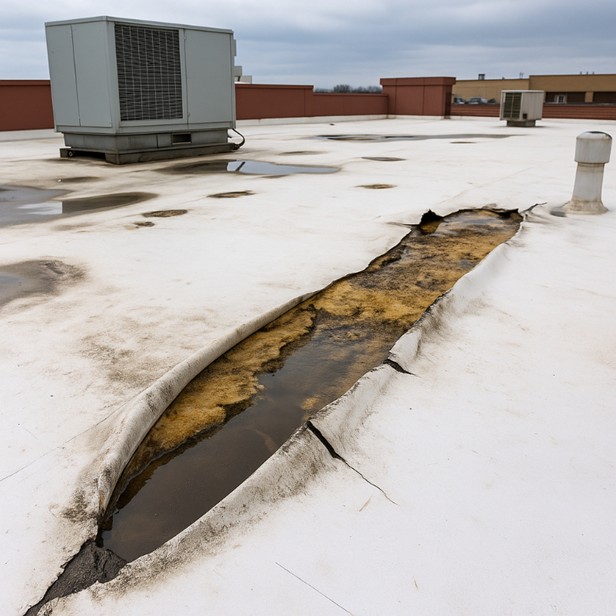 While the top layer may appear intact, the bond between the roof system and the substrate may be weakened, especially at perimeters and corners.